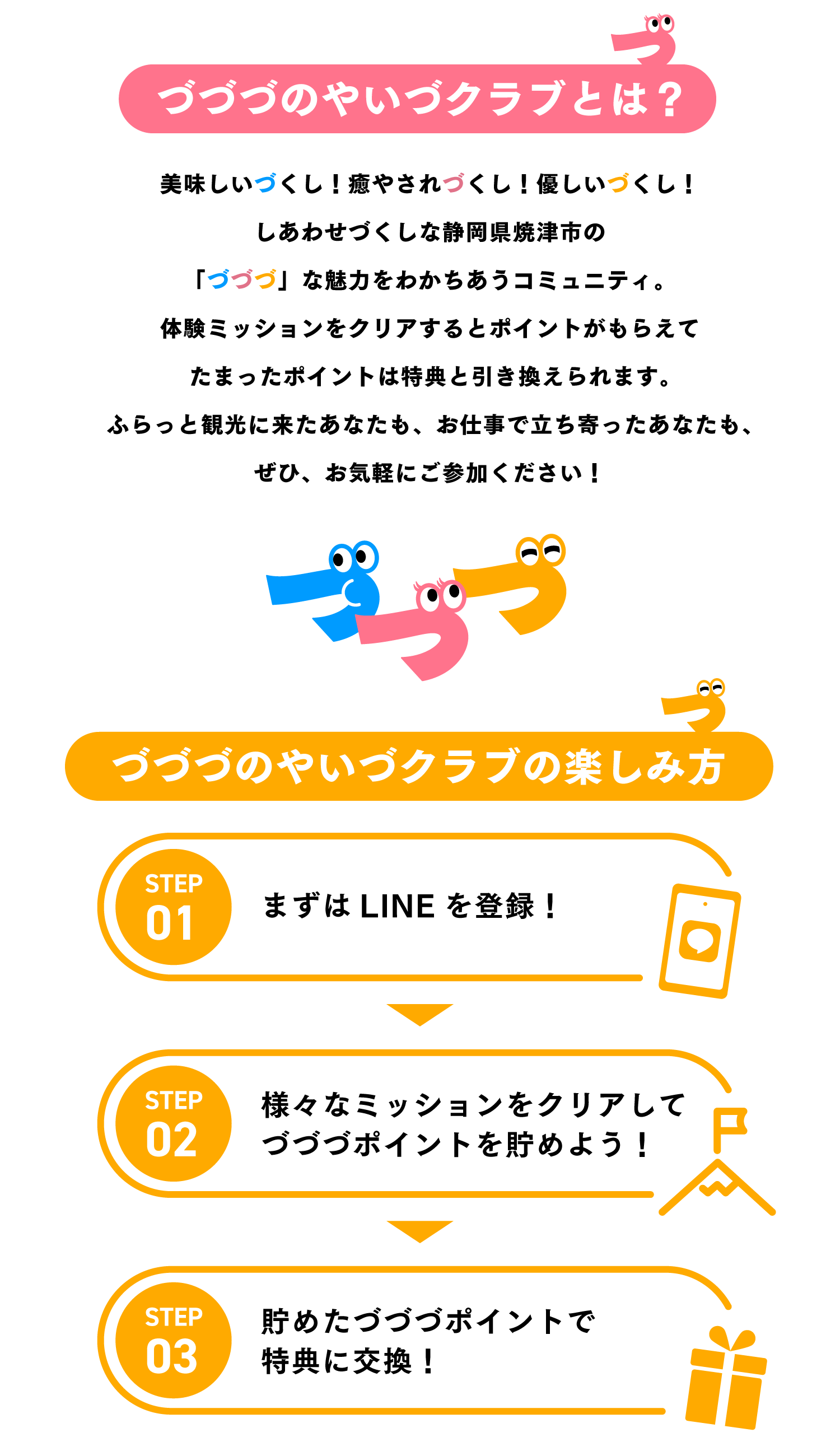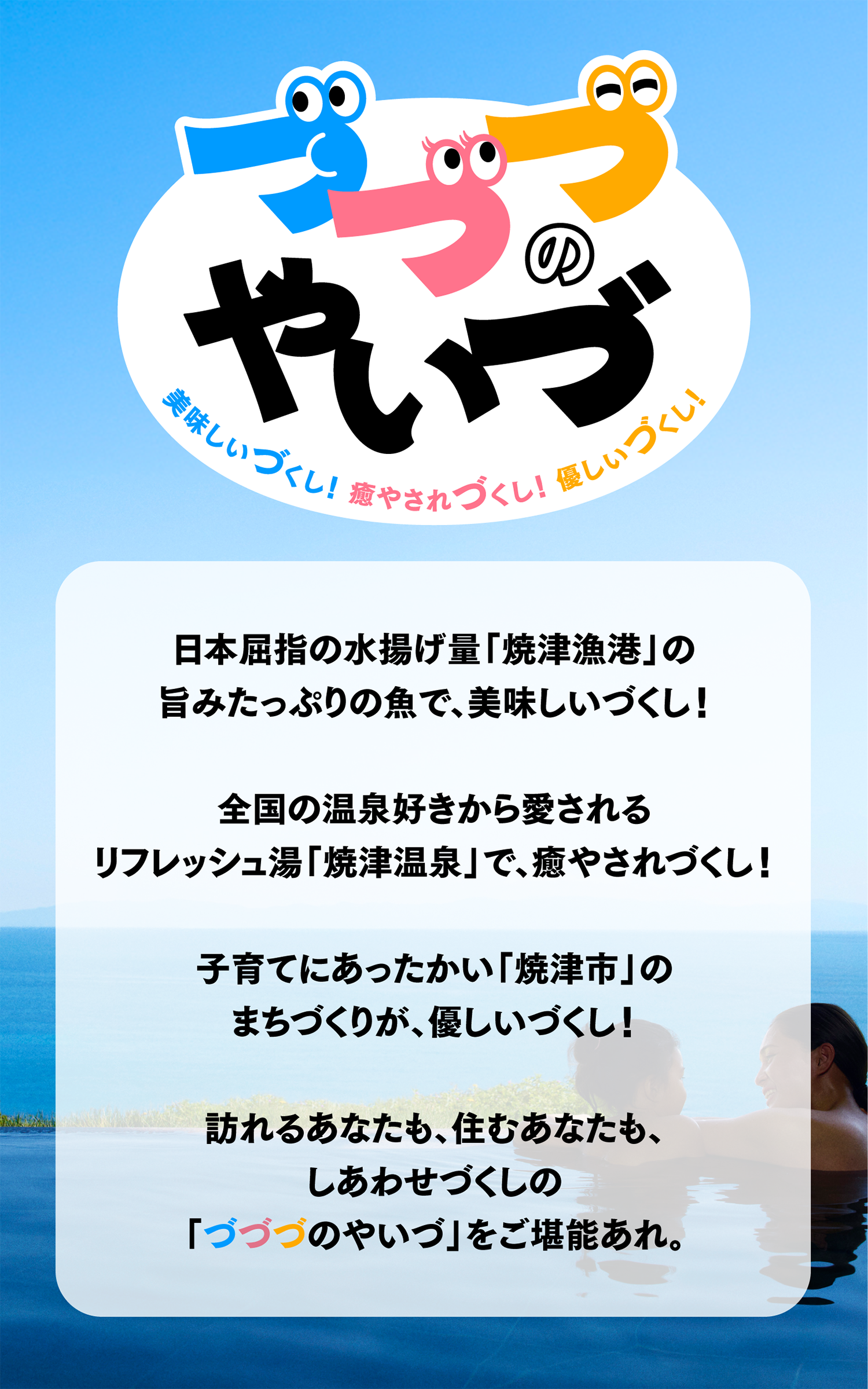づづづのやいづクラブ(以下「本キャンペーン」といいます)は、焼津市以下「当市」といいます)が運営するプログラムです。本キャンペーンをご利用されるには、以下の利用規約(以下「本規約」といいます)の全ての条項にご同意いただく必要がございます。本キャンペーンのご利用開始をもって、本規約の全てにご同意いただいたものとさせていただきます。よく内容をご確認のうえ、お進みください。